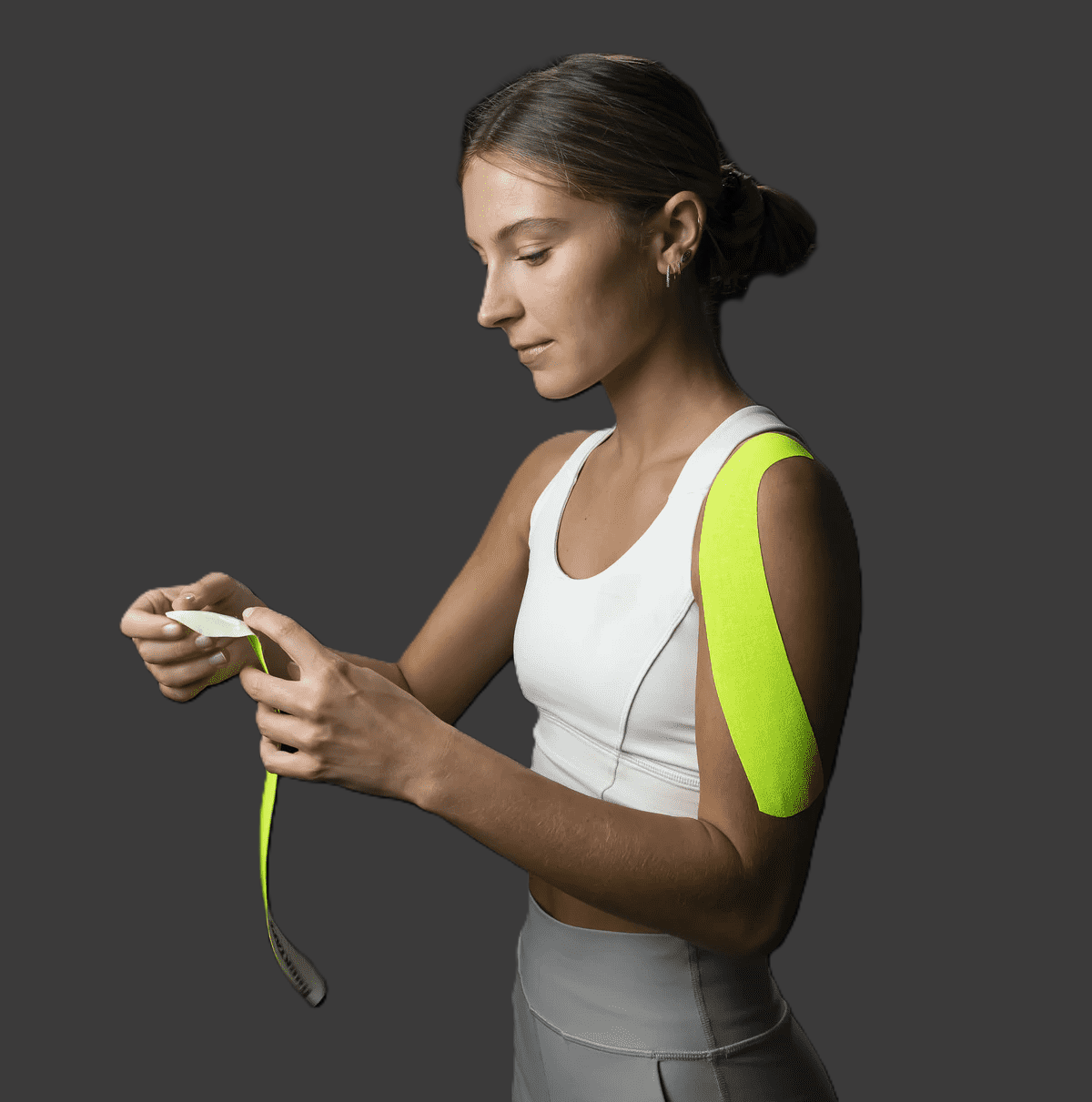 Начало накладки: приклейте один конец ленты к коже (без натяжения), а затем начинайте натягивать по нужной траектории. Убедитесь, что вы следуете естественным контурам тела.