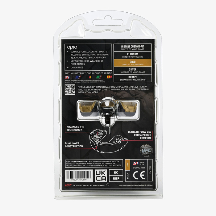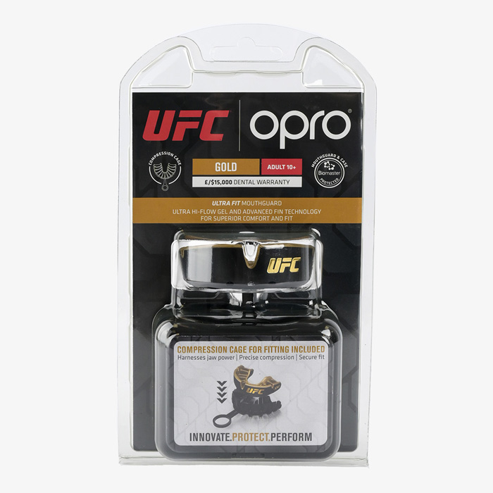 Боксерская капа Opro Gold Level является совместной работой с проектом UFC. Основным отличием и ключевой особенностью является запатентованная система ребер по внутренней части капы. Данная технология способствует созданию точного слепка зубов, с учетом индивидуальных анатомических особенностей челюсти. Несколько слоев внутреннего формовочного геля, обеспечивают не только точное повторение формы зубов и десен, но и непревзойденную защиту. Благодаря этой технологии капа плотно фиксируется на зубах, обеспечивая максимальную защиту.
