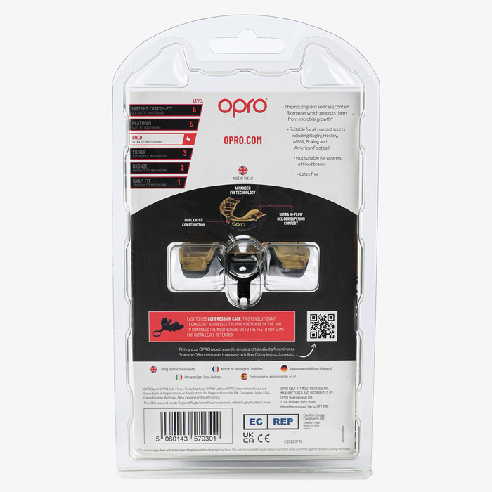 Боксерская капа Opro Gold Level обеспечивает превосходный комфорт и защиту. Основным отличием и ключевой особенностью является запатентованная система ребер по внутренней части капы. Данная технология способствует созданию точного слепка зубов, с учетом индивидуальных анатомических особенностей челюсти. Несколько слоев внутреннего формовочного геля, обеспечивают не только точное повторение формы зубов и десен, но и непревзойденную защиту. Благодаря этой технологии капа плотно фиксируется на зубах, обеспечивая максимальную защиту.
