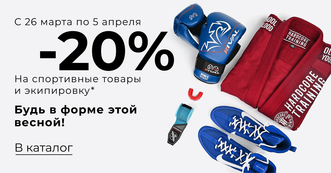 *Акция не распространяется на категории: «Распродажа», «Обувь» (кроме бренда Nike), «Сертификаты», «Прочее»; Бренды исключения: «Cleto Reyes», «Grant», «RaveTape», «RockTape», «Tyr», «Winning» и не работает с другими акциями и скидками.